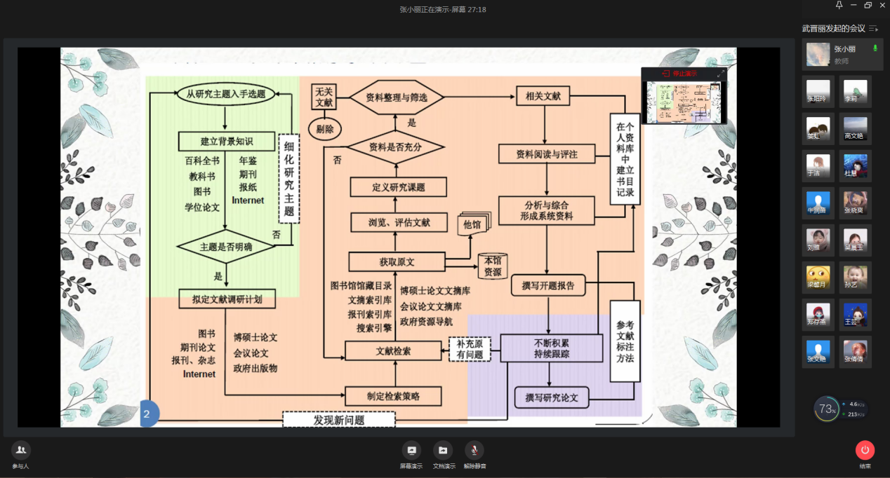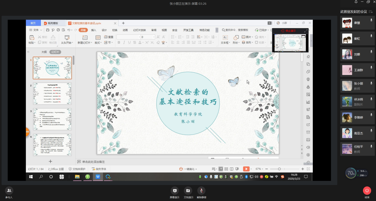 在新冠肺炎疫情防控的特殊时期,为更好培养公司研究生的学术规范意识,扎实学术研究基础,提升学术研究能力,公司研究生教学工作领导小组于2020年3月23日下午,特邀公司副教授张小丽老师为全院教育类的硕士研究生做了关于“文献检索的基本途径和技巧”的线上专题讲座,公司部分教师旁听了讲座(师生共计280人)。