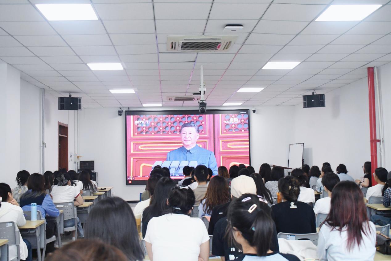 在纪念大会上,师生们共同聆听了习近平总书记发表的重要讲话,深刻认识到铭记历史、缅怀先烈、珍爱和平、开创未来的重要意义。在随后的阅兵仪式上,徒步方队、装备方队与空中梯队依次通过天安门广场和上空,多项现役主战装备和战略重器,有力展示了我国坚决捍卫国家主权、坚定维护世界和平的钢铁意志和强大实力。期间,飒爽英姿的军人风貌和装备精良的国防实力令师生们不时发出赞叹和掌声,大家深刻感受到中国人民历经十四年浴血奋战,以巨大牺牲赢得胜利的壮阔历程,也为国家今天取得的瞩目成绩和繁荣富强感到无比自豪。
